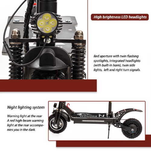 Advanced Features: The scooter comes with an electronic brake and a disc brake system for quick stops, ensuring safety while riding. Plus, the scooter is fitted with a front LED headlight and taillight with brake flash warning lights, providing increased visibility during night rides.