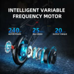 240W variable frequency high-speed motor provides powerful kinetic energy, allows smooth starts and accelerates. The folding electric bike can run up to 25 km/h.