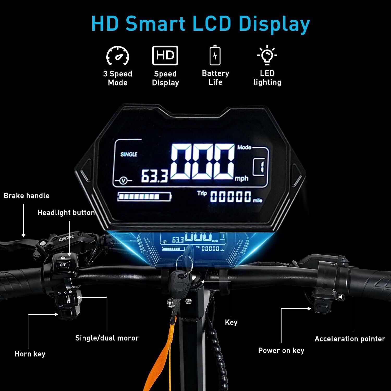 Key features include a smart LCD display for easy controls, front and rear LED lights for visibility, and