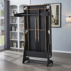 The 6FT Foldable Pool Table features a sleek black wood finish that suits any game room, garage, or spare room. Its vertical folding design makes it an ideal solution for smaller spaces, allowing you to easily store it away when not in use. The sturdy, robust construction ensures lasting performance, while the spare leg support and built-in wheels make moving and storage hassle-free.