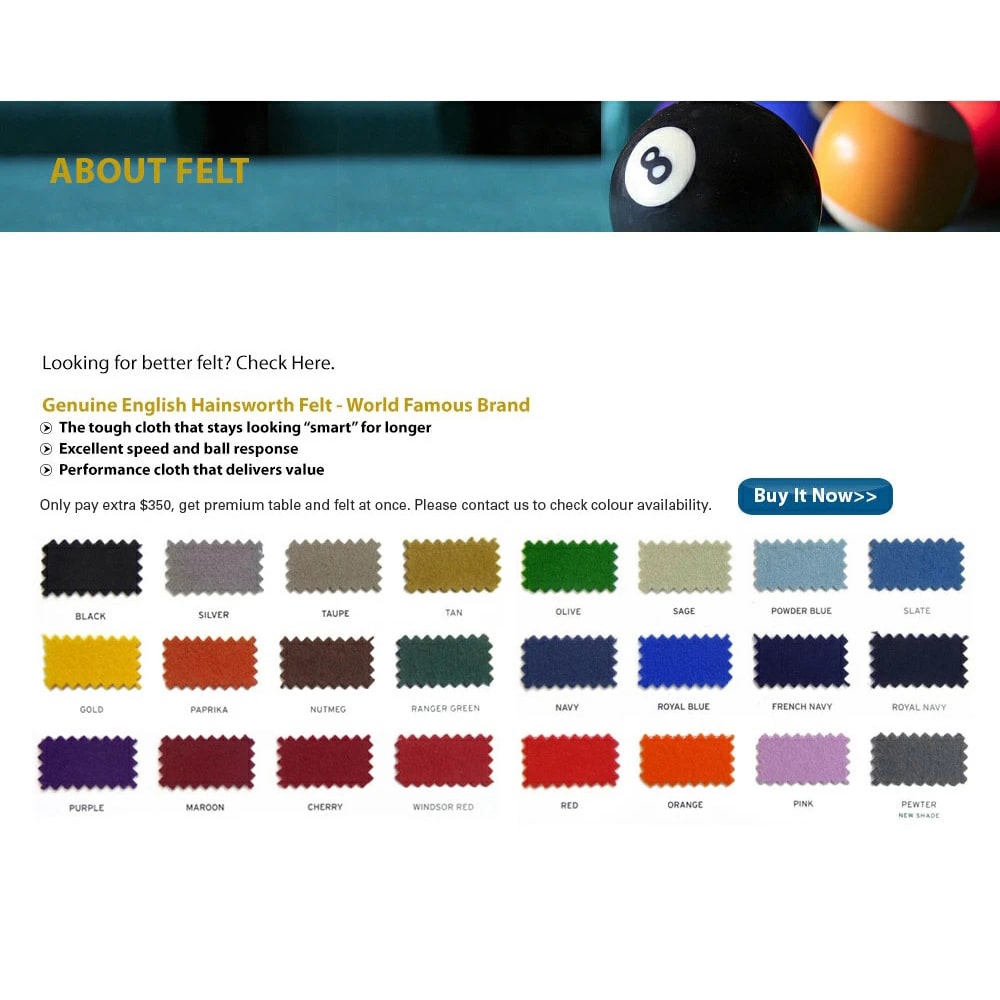 High-quality slate billiard table! Fast Delivery Australia-wide! Fast delivery to Sydney, Melbourne, Brisbane, Hobart, Adelaide, and Canberra. Slate Pool Table Drop Pockets. Table Dimensions 210cm x 126cm x 83 cm Table Height 83 cm Solid timber rails and legs. Precisely honed 3-piece slate provides a smoother surface and better playing experience. Super solid timber legs, and a square-shaped top, allowing cabinet weight to rest directly on the leg shield. British high-speed wool felt. Hand-stitched leather shields and top-quality long-lasting net pockets. Detailed moulding on the base and corner blocks creates clean lines and a classic finish. Includes free accessories 2x Billiard Cues 1x Pool Ball Set, 1x Chalk set, 1x Triangle!