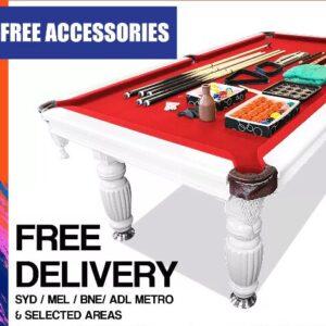 This 8ft Slate pool table Victory II is known as "The Victory"! The Victory II Plus features a unique pedestal and legs that look like a “V” from each side of the table. Victory is equipped with Rasson designed and patented SLS (Slate Leveling System) and LLS (Leg Leveling System) as well TPR material pockets.7ft Slate Pool Table Luxury White Solid Timber Frame Red Felt