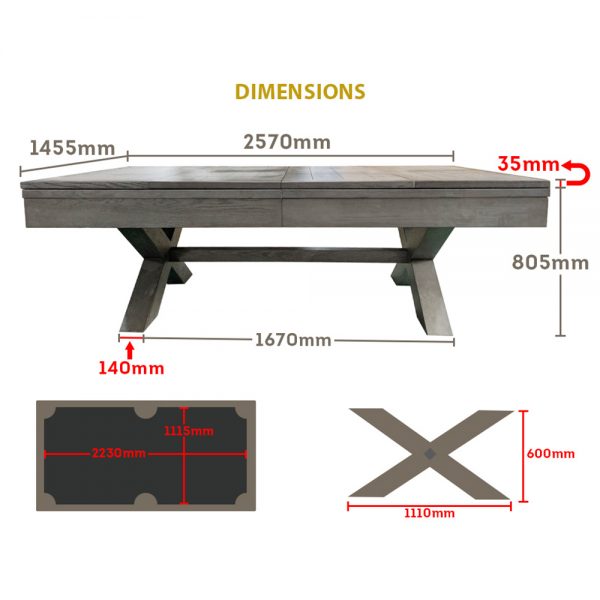 - Dimensions table: 2570mm x 1455mm x 805mm