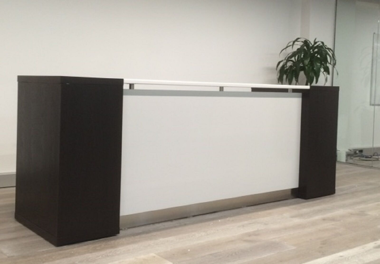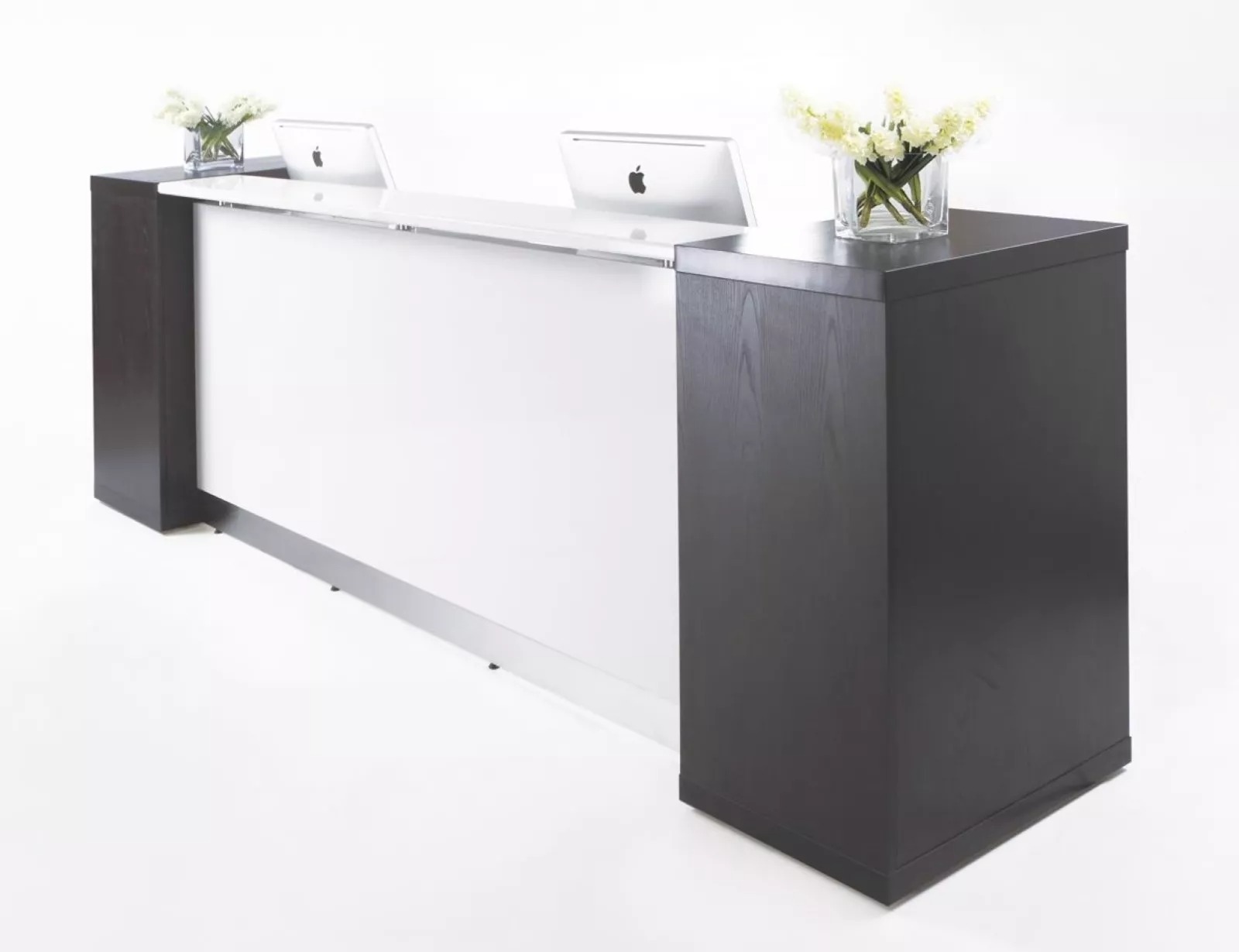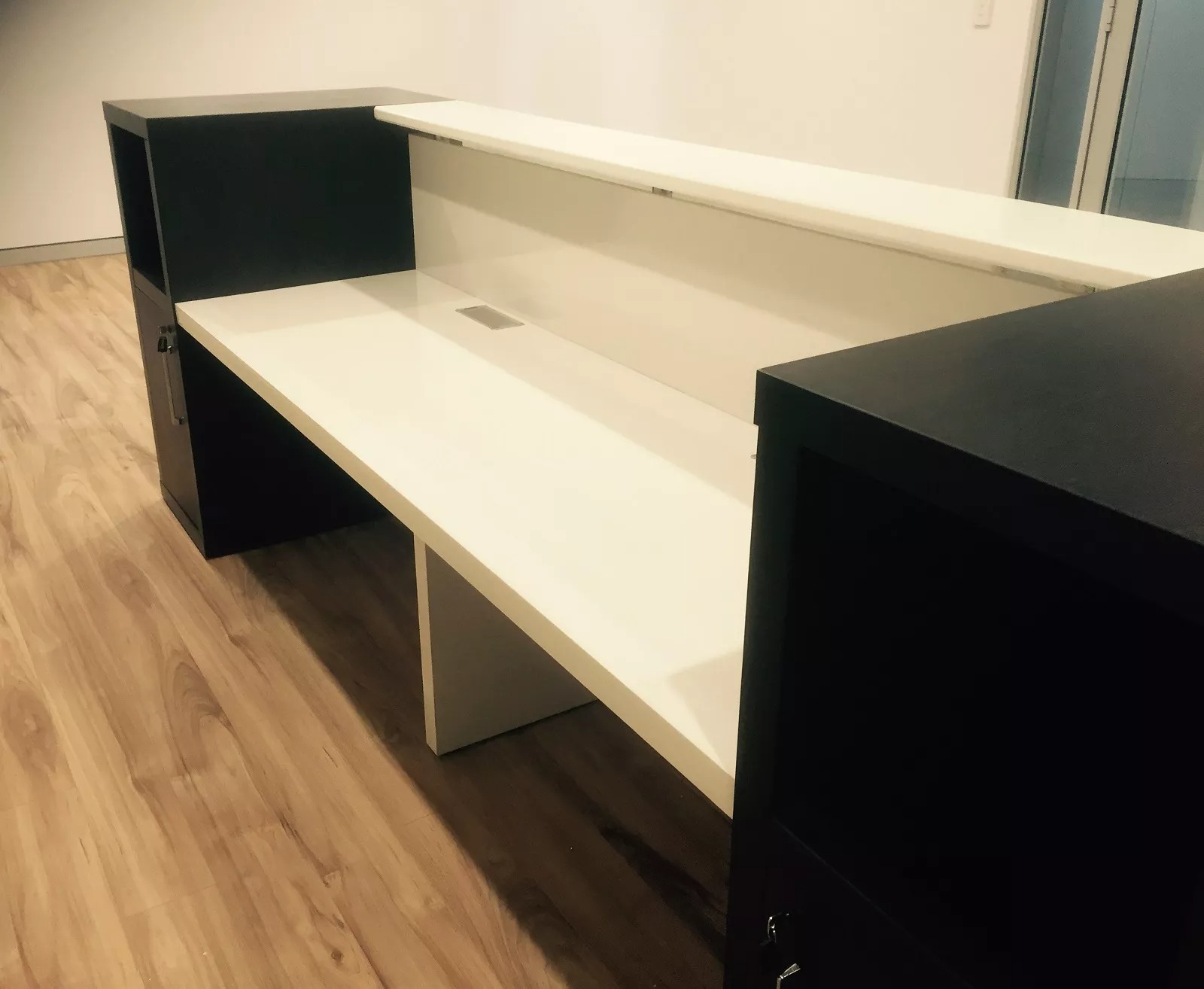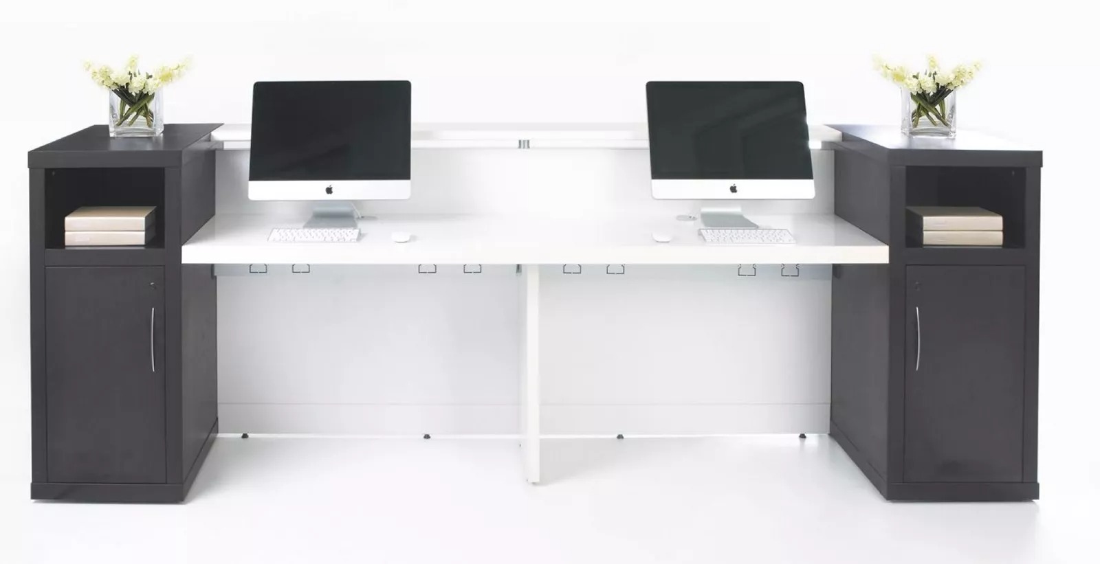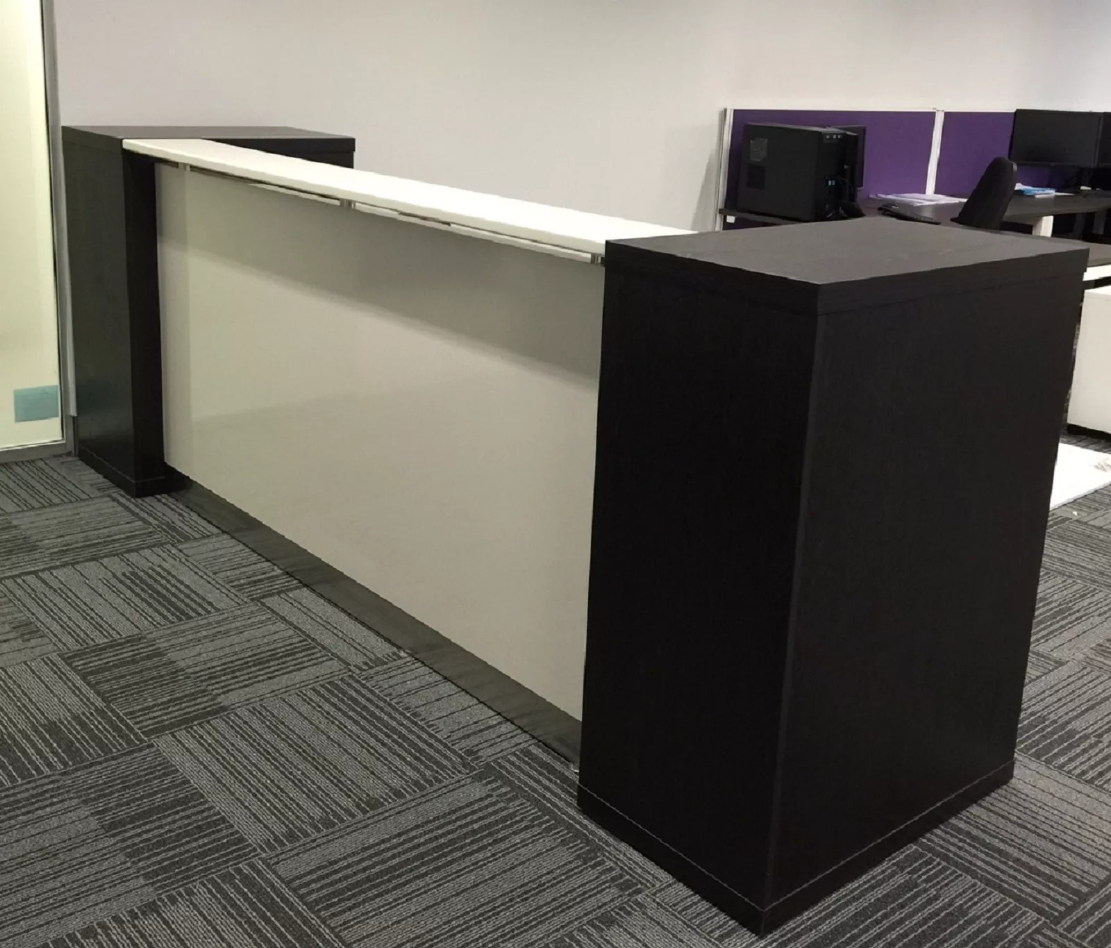 Enhance your workspace with this stylish and functional reception desk featuring a matt white front panel, dark woodgrain end cabinets, and a polished white stone hob. Designed for durability and customisable to suit your needs, this reception counter is the perfect addition to any office or clinic.