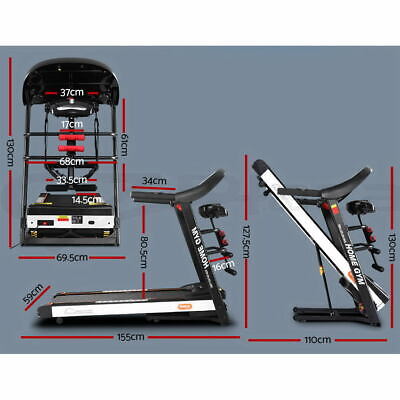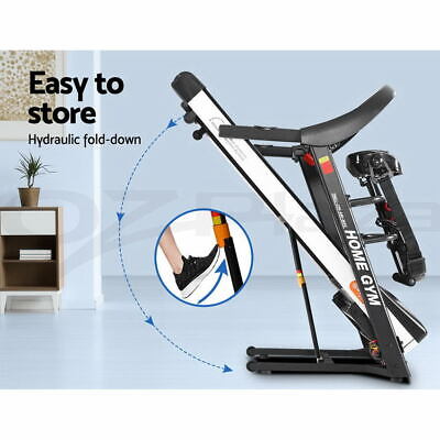 This Everfit trreadmill is compact and sturdy with its powder-coated steel frame, our Everfit Electric Treadmill allows you to perform essential cardio exercises within the comfort of your home. It features 12 pre-set training programs designed to simulate natural terrain. A user-centric control panel with a digital LCD display lets you set up to 18-speed levels and other monitoring parameters. Its powerful motor produces smooth and seamless operation and the anti-slip belt and soft-grip handlebar with pulse sensors make your session a comfortable and controlled experience. Other great features include a 15-level inclination adjustment, an innovative double shock absorption system, a safety tether key, a hydraulic fold-down for easy folding and storage, and smooth wheels for easy mobility. Not least, the treadmill is also equipped with USB and MP3 connection, twin speakers, and dual drink holders to keep you entertained and hydrated. Best of all, the treadmill has a multifunctional workout system built in with a massage belt, sit-up bar, and two dumbbells to allow for more fun and varied exercise.