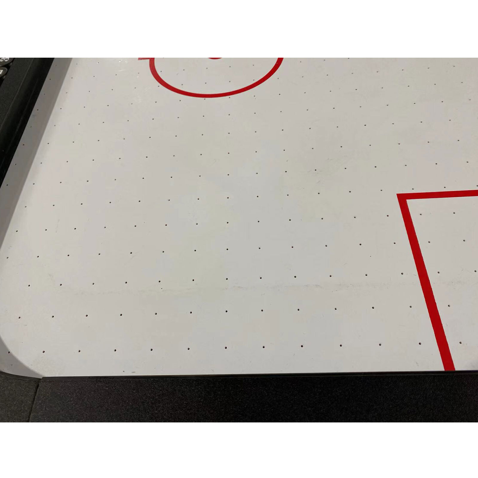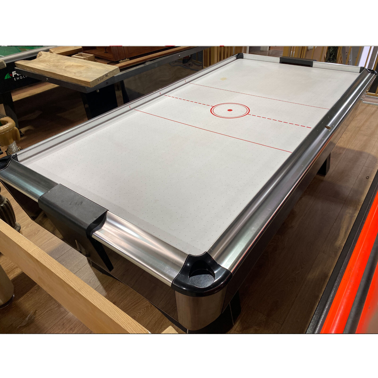 Ex-rental 8ft PVC rhino air hockey table, with scratches/marks on the body and play surface, a dent on the playing surface, as pictured. Sale as it is.