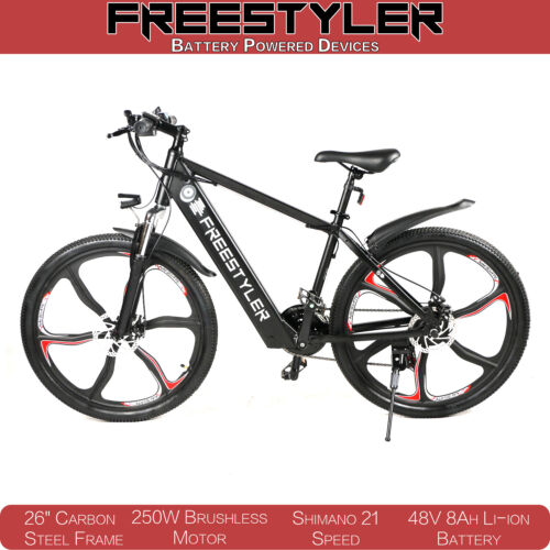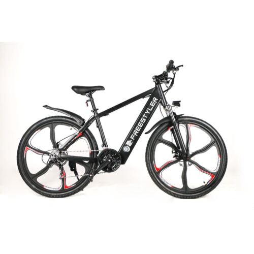 Freestyler 26″ electric mountain bike. This model is feature-packed and comes with magnesium alloy rims, 21-speed Shimano gears, a massive 8Ah battery, and a frame made of carbon steel. Combined with an elegant and sleek design, the Freestyler 26″ mountain bike is an excellent choice for commuting and leisure.