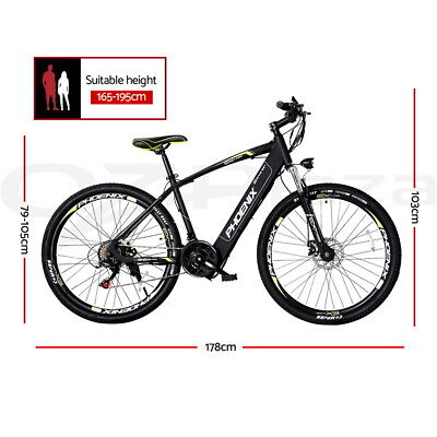Have you been looking for a more sustainable way to get around? Or do you want more freedom to enjoy the great outdoors? Take your fitness to the next level and find a unique solution to your daily commute with the Phoenix 27.5” Electric Bike. With its powerful 250W motor and built-in 36V 10.4Ah Li-ion battery, the Phoenix Electric Bike can ride up to 40 km on a single charge and reach speeds of 25 km an hour. The bike is made from premium parts such as the Shimano 7-speed gear system and derailleur. You’ll find it easy to ride a wide range of terrains from the mountains to the suburbs, and you’ll be able to do it in safety and comfort with the durable wheels and tyres, dual front and back brakes, a front suspension fork, and a height-adjustable saddle for the perfect comfortable ride. Features a front light and reflector for added safety during your evening ride. Your package includes two wrenches, three hexagonal wrenches, a bolt driver, and a security key for easy installation and maintenance. Forget driving a bulky car around the city or in the country – enjoy a more sustainable and healthier ride with a Phoenix 27.5” Electric Bike.