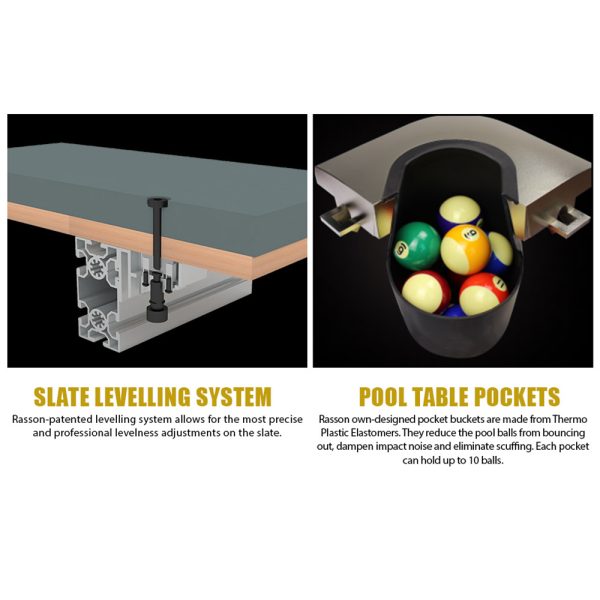 At the core of its precision lies the Rasson Slate Levelling System (SLS) and Leg Levelling System (LLS), both meticulously designed and patented to ensure an exact and reliable adjustment of the table’s levelness. This innovative technology not only guarantees a perfectly even playing surface but also reflects Rasson’s commitment to pushing the boundaries of billiards engineering.